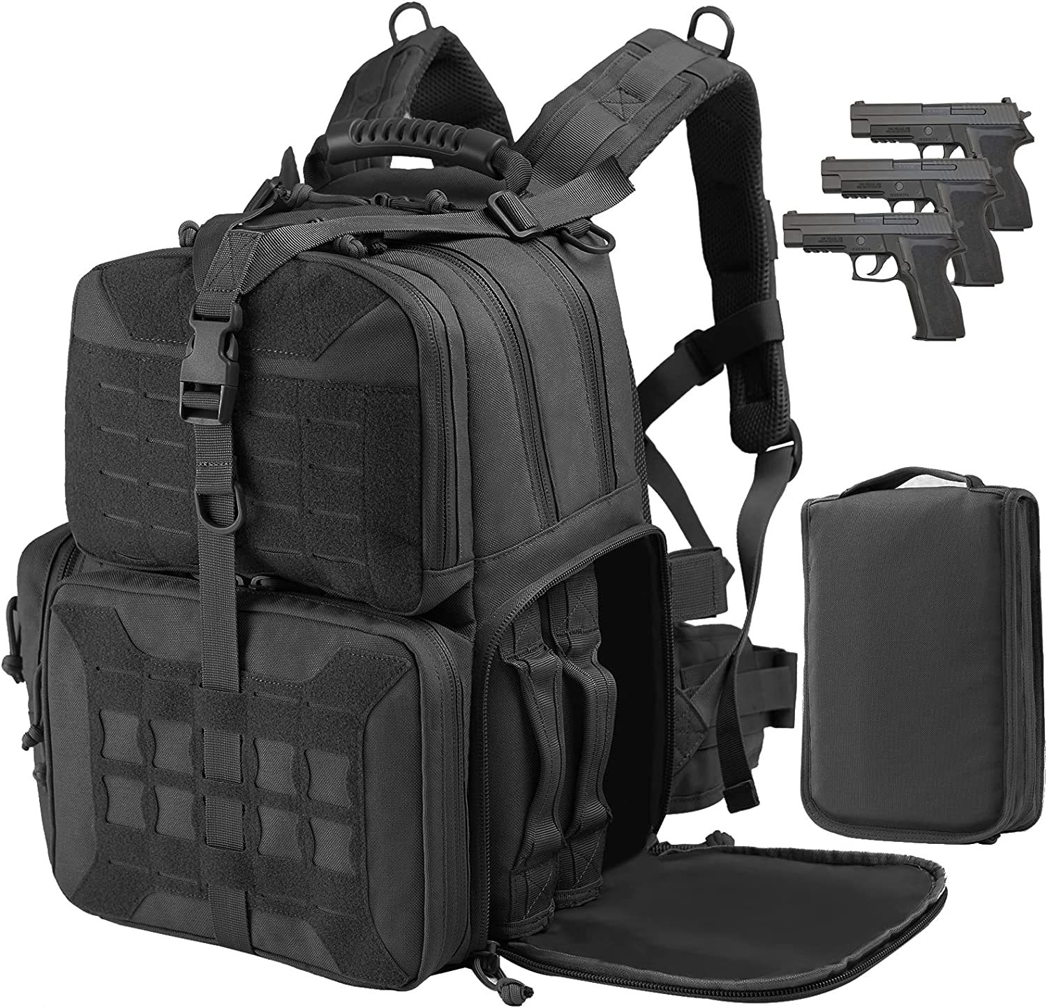 - Durable Design With 1000D Nylon: This Tactical range bag is made of 1000D polyester fabric, sturdy, water-resistant, durable, suitable for tactical range activity and outdoor shooting or hunting. Three removable pistol cases built-in sponges can protect guns and ammo more effective, avoid wear and tear.