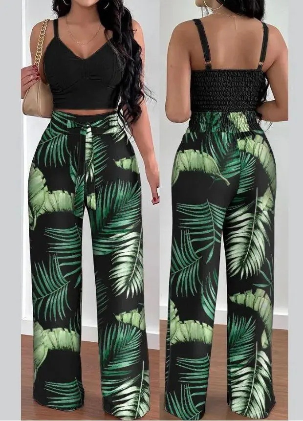 Be the first to review “Women’s Solid Color Slim Elastic Pleated Two-Piece Suit Sexy Spaghetti Strap V-neck Backless Vest High Waist Wide Leg Pants Suit”
